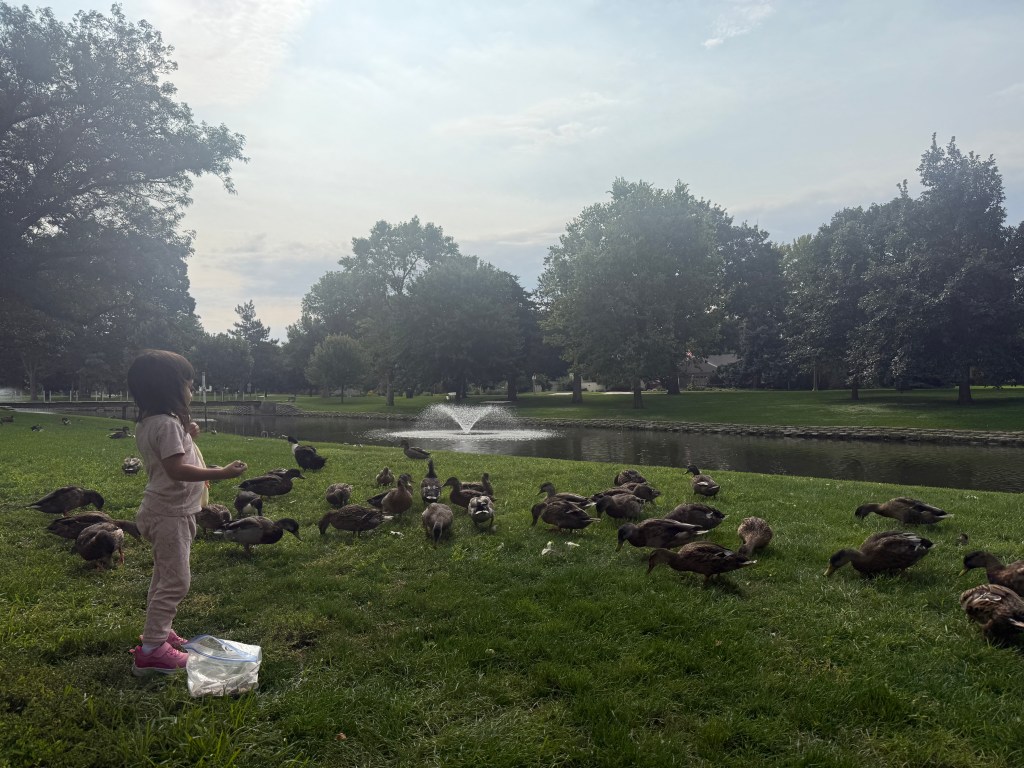 Most mornings, we take a walk to the park. My toddler loves feeding the ducks, proudly tossing seeds into the water while my baby watches quietly from the stroller.