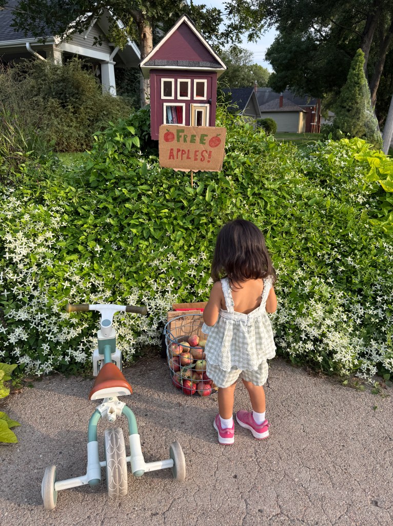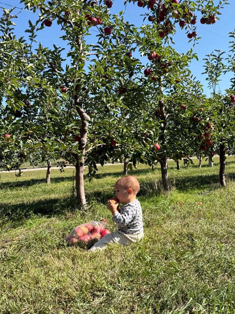 We made a short road trip to a nearby prairie apple orchard—the air was warm, the breeze soft. My baby toddled barefoot through the grass while my toddler proudly filled her basket, sneaking bites between picks.